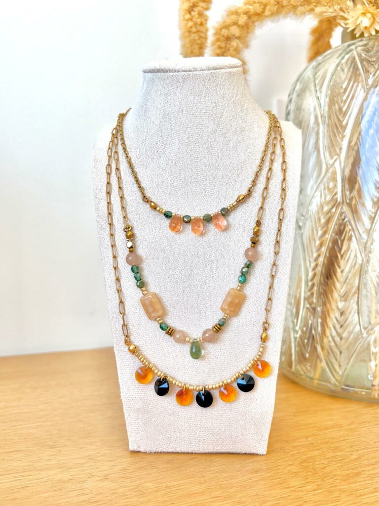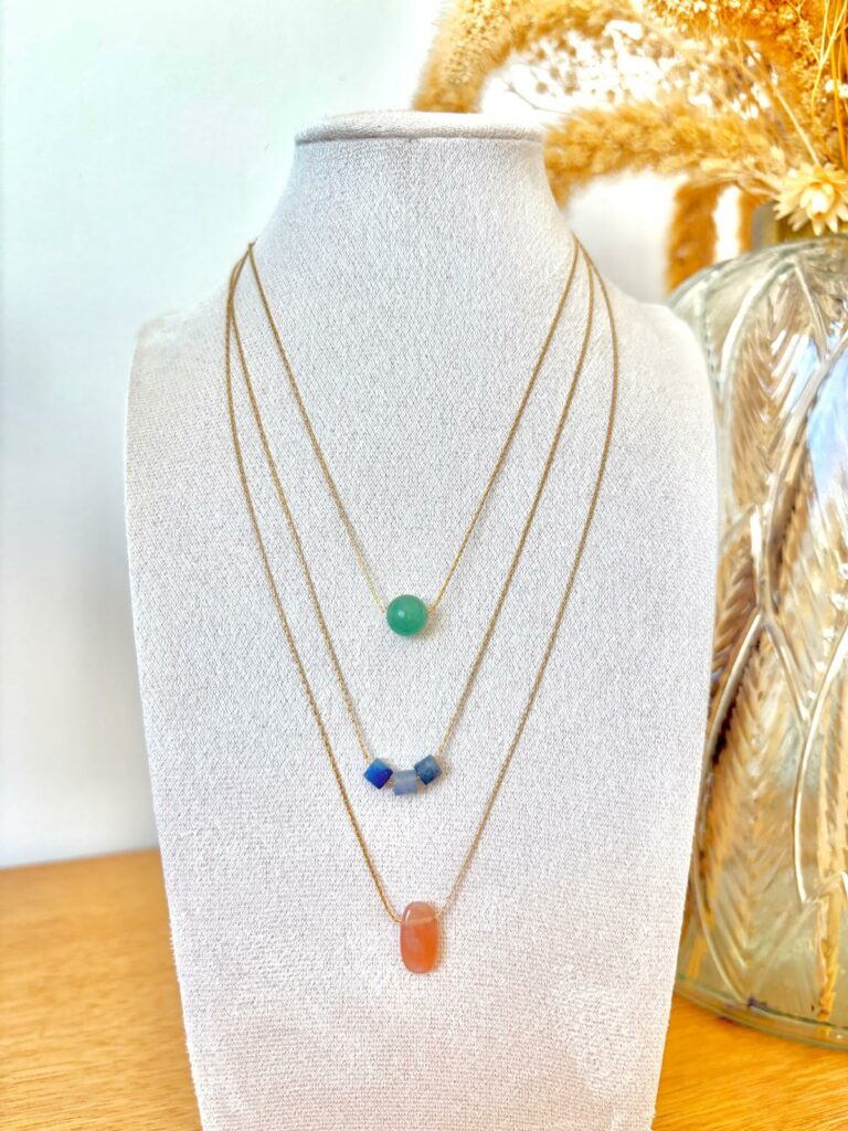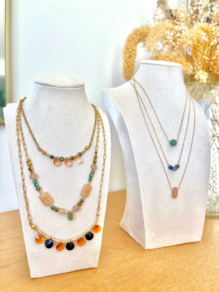 Chaque collier est imaginé et assemblé à la main avec soin, pour offrir une pièce unique qui raconte une histoire. Entre perles, pampilles et touches dorées, chaque création apporte une dose de poésie et de caractère à ton style.