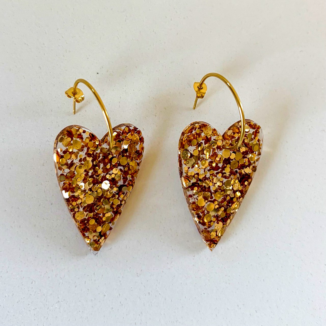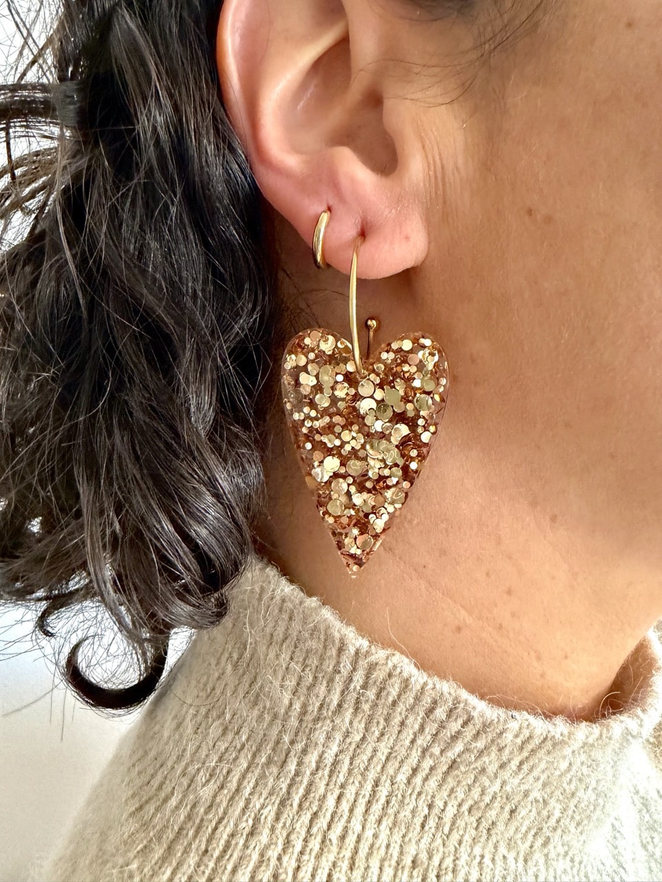 Boucles d’oreilles cœur long au rendu transparent et aux reflets dorés. Un modèle élégant et léger, facile à porter au quotidien comme en soirée.