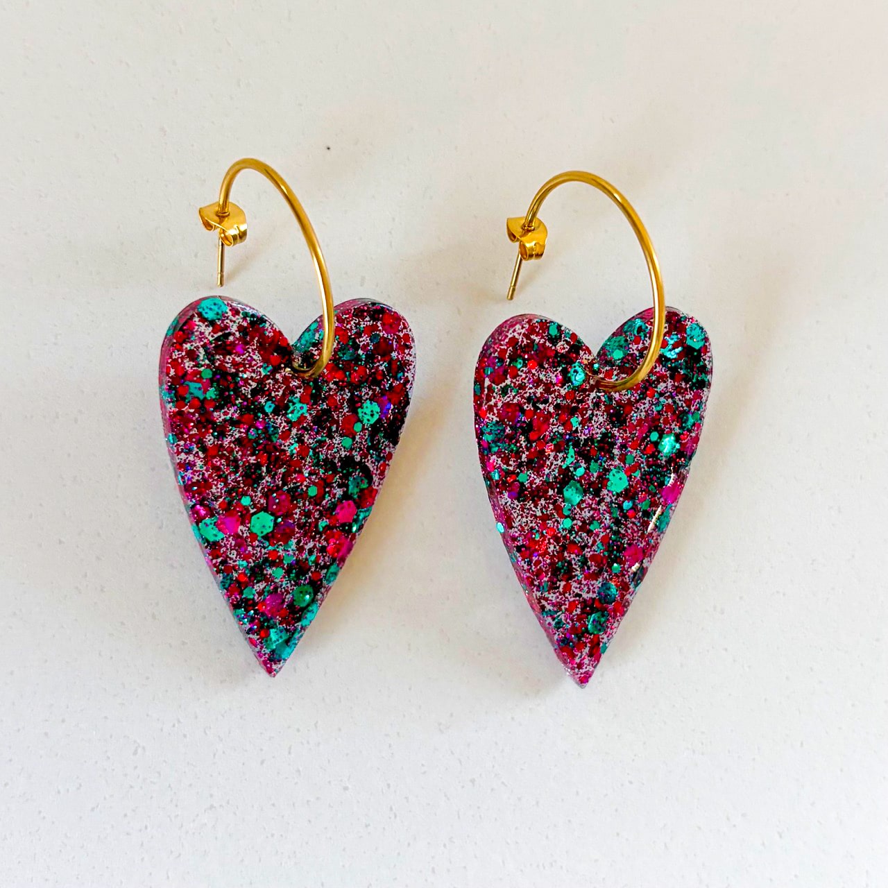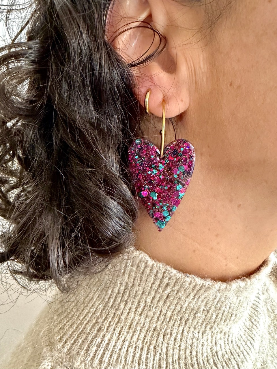 Boucles d’oreilles en forme de cœur allongé, aux éclats multicolores uniques. Un bijou lumineux et expressif, idéal pour apporter une touche de fantaisie à une tenue simple.
