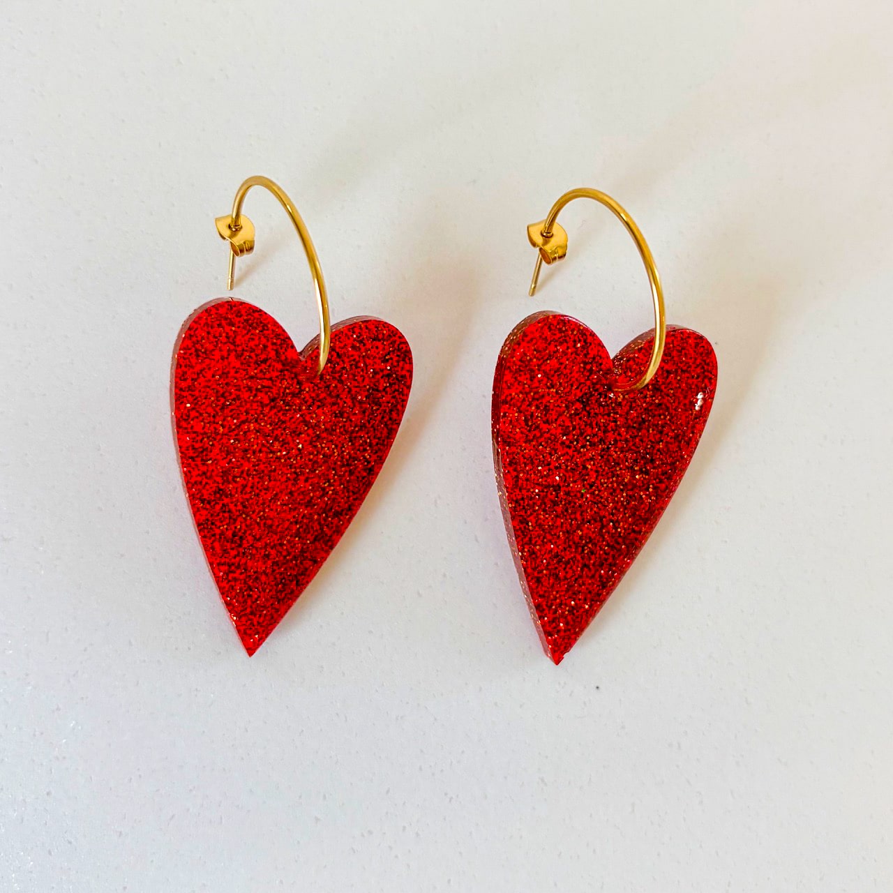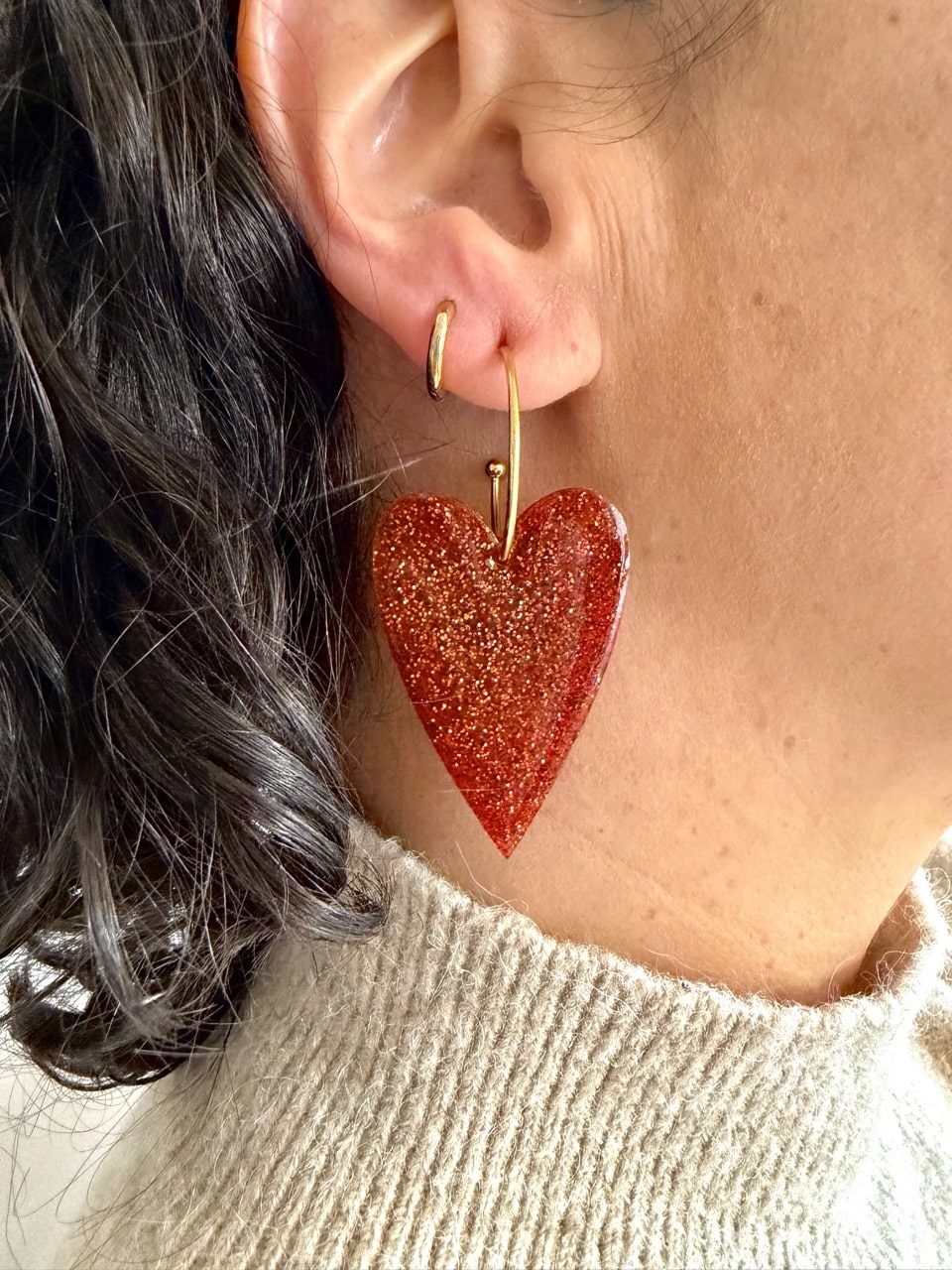 Boucles d’oreilles en forme de cœur long, dans un rouge intense et pailleté. Un bijou affirmé, parfait pour sublimer une tenue avec caractère.