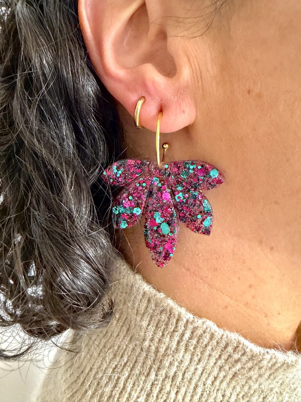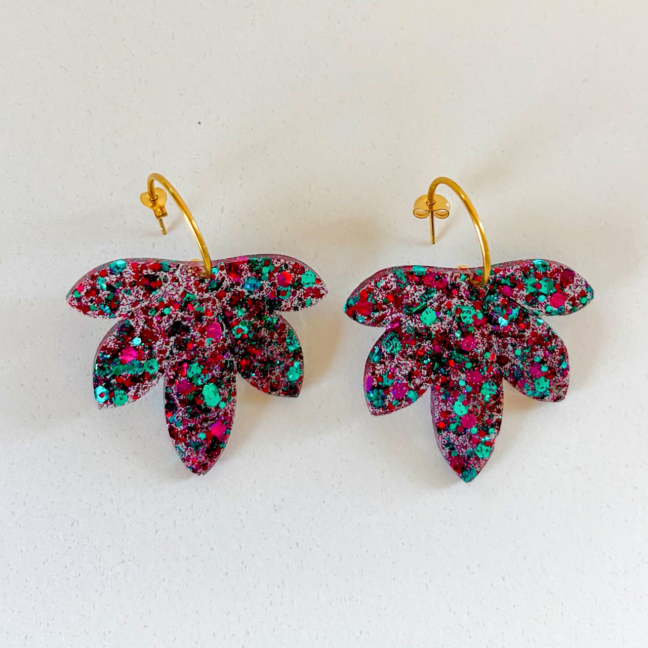 Boucles d’oreilles en forme de feuille, aux couleurs multicolores éclatantes. Un bijou graphique et audacieux, parfait pour un style affirmé.