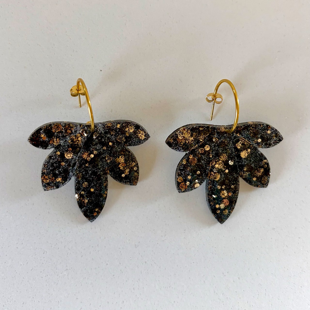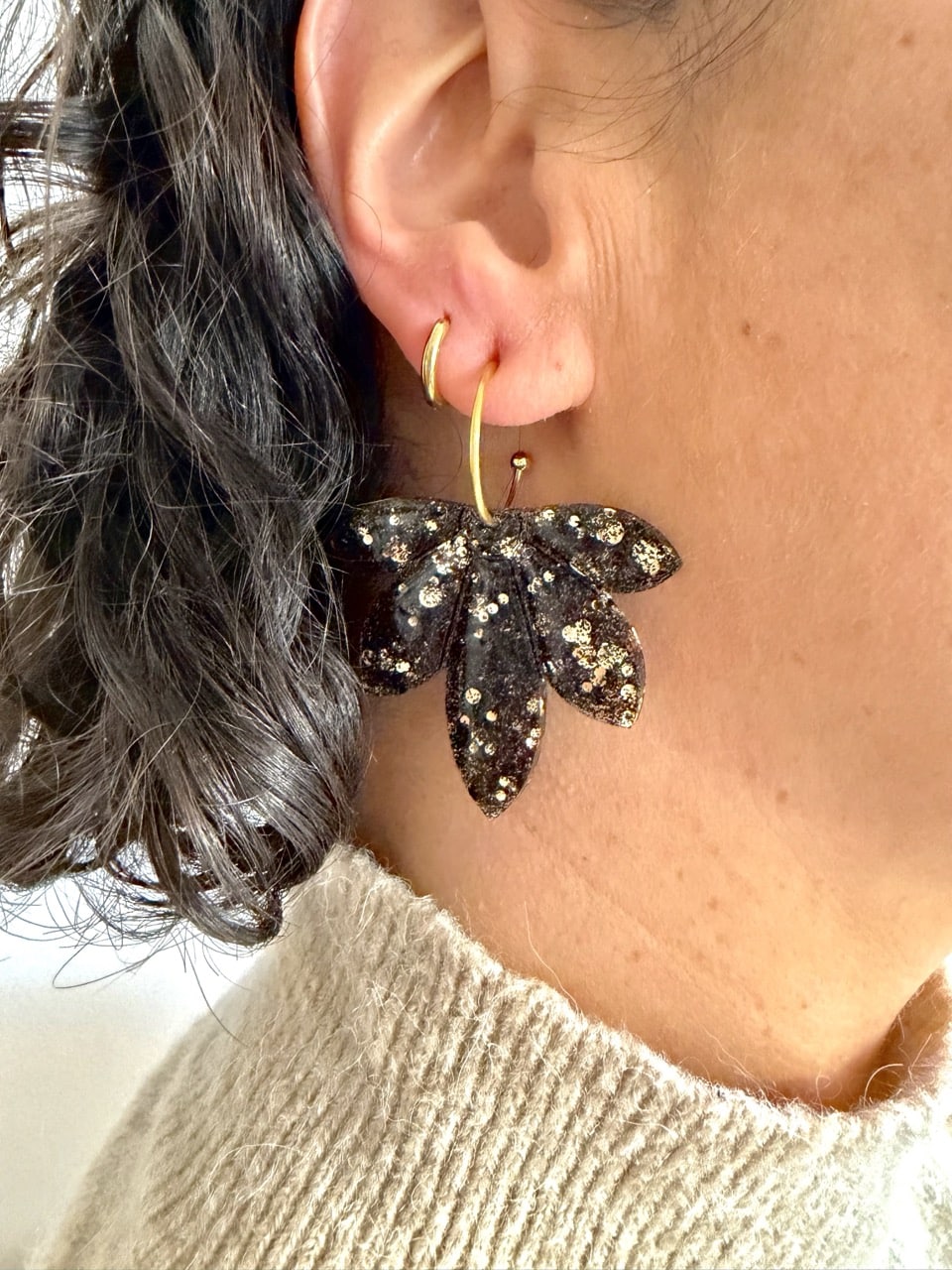 Boucles d’oreilles feuille noires, subtilement ponctuées de doré. Un bijou élégant et contrasté, facile à porter de jour comme de nuit.