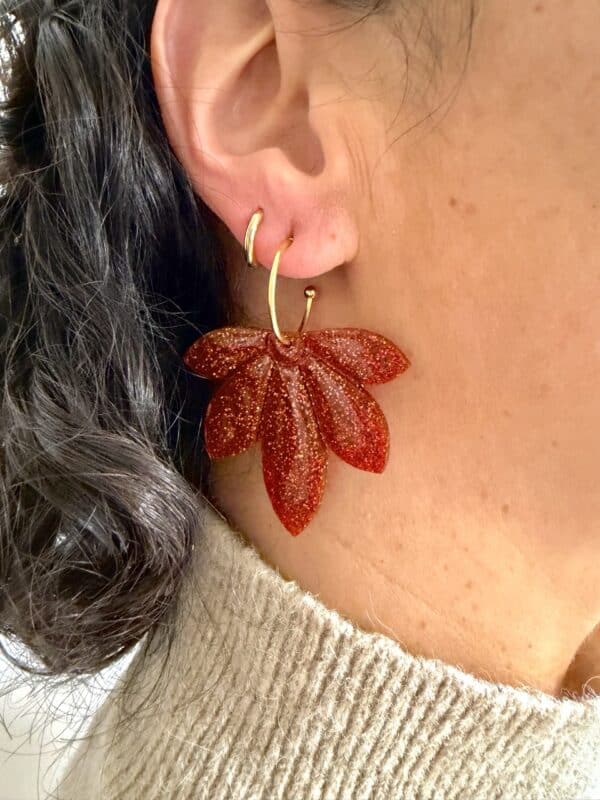 Boucles d’oreilles en forme de feuille, dans un rouge pailleté intense. Un bijou lumineux et affirmé, idéal pour apporter une touche de caractère à une tenue.