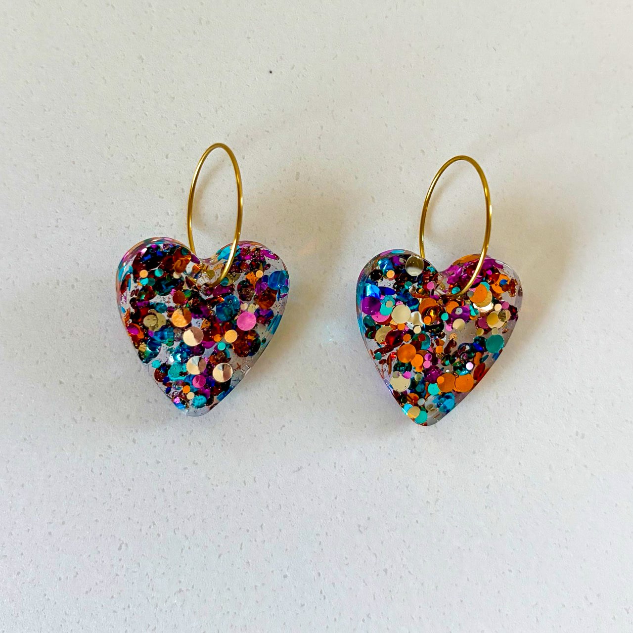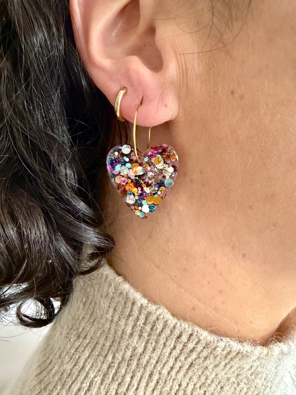 Boucles d’oreilles petit cœur au rendu transparent, parsemées de touches colorées. Un bijou délicat et lumineux, facile à associer.